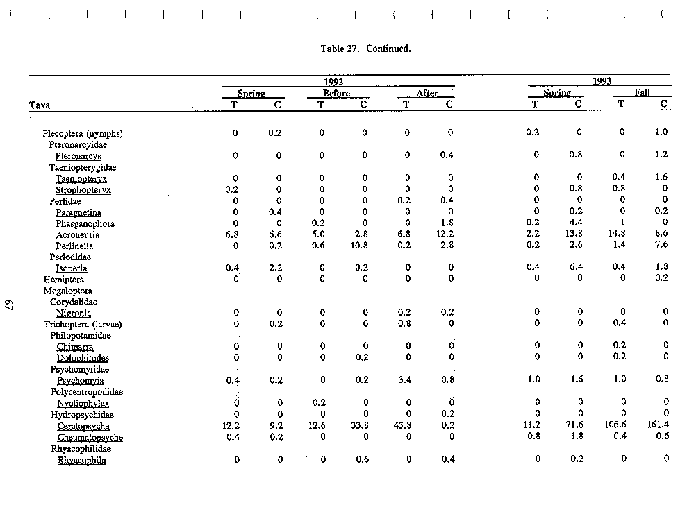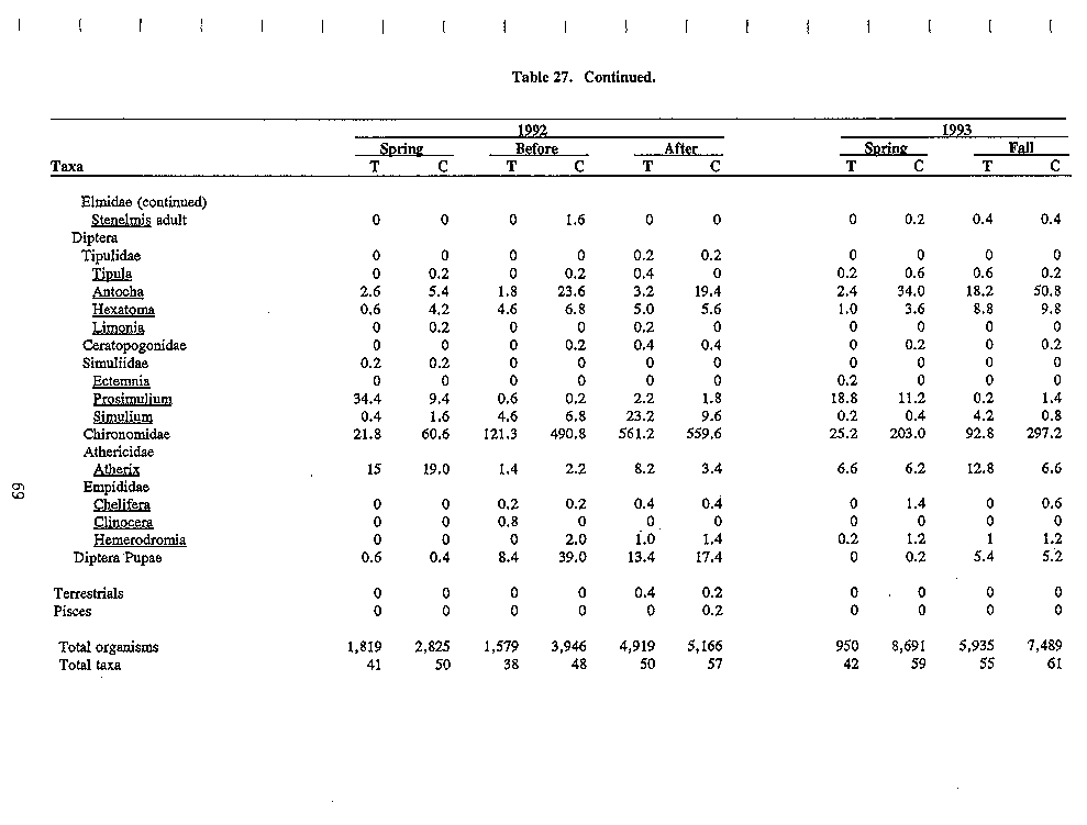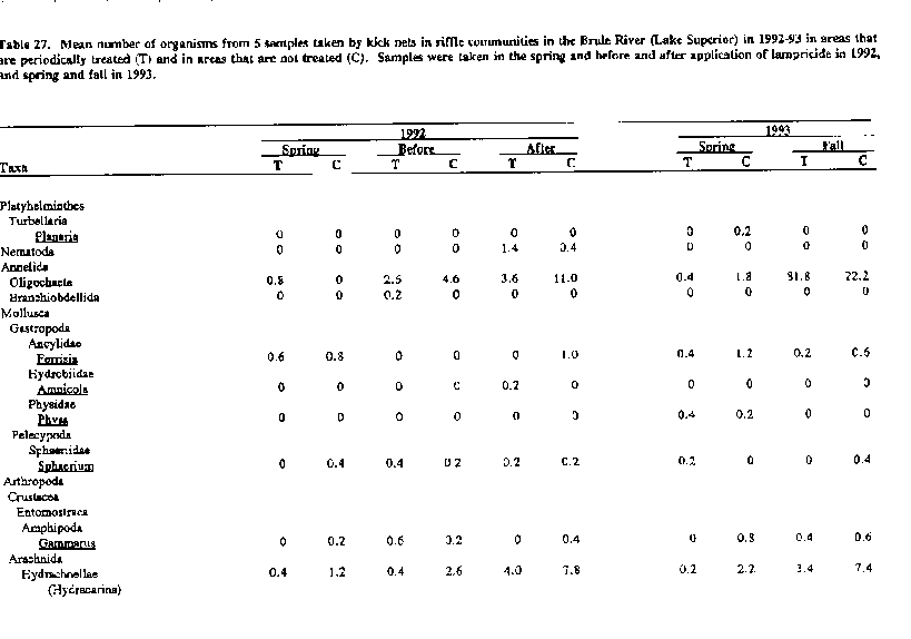 Table 27: Mean number of organisms from 5 samples taken by kick nets in riffle communities in the Brule River (Lake Superior) in 1992-1993 in areas that are periodically treated (T) and in areas that are not treated (C). Samples were taken in the spring and before and after application of lampricide in 1992, and spring and fall of 1993.